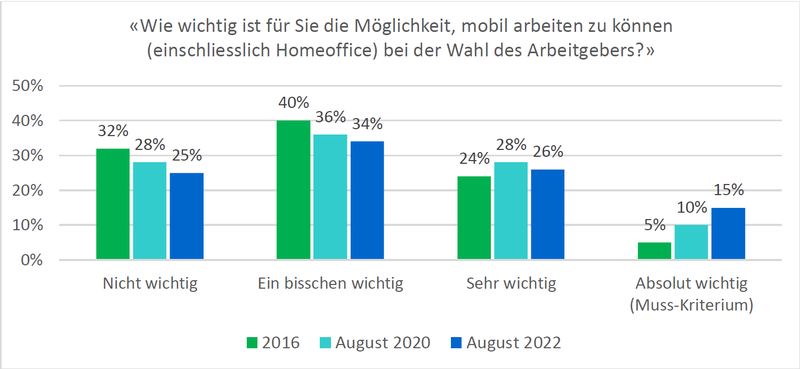 - Die Ansprüche der Beschäftigten werden grösser: 28 % der befragten Erwerbstätigen können sich nicht mehr vorstellen, nur noch vor Ort beim Arbeitgebenden zu arbeiten. Und für 15 % aller Erwerbstätigen ist die Möglichkeit, mobil zu arbeiten, ein absolutes Muss-Kriterium bei der Jobsuche. 2016 sagten dies nur 5 % (siehe Abbildung unten).