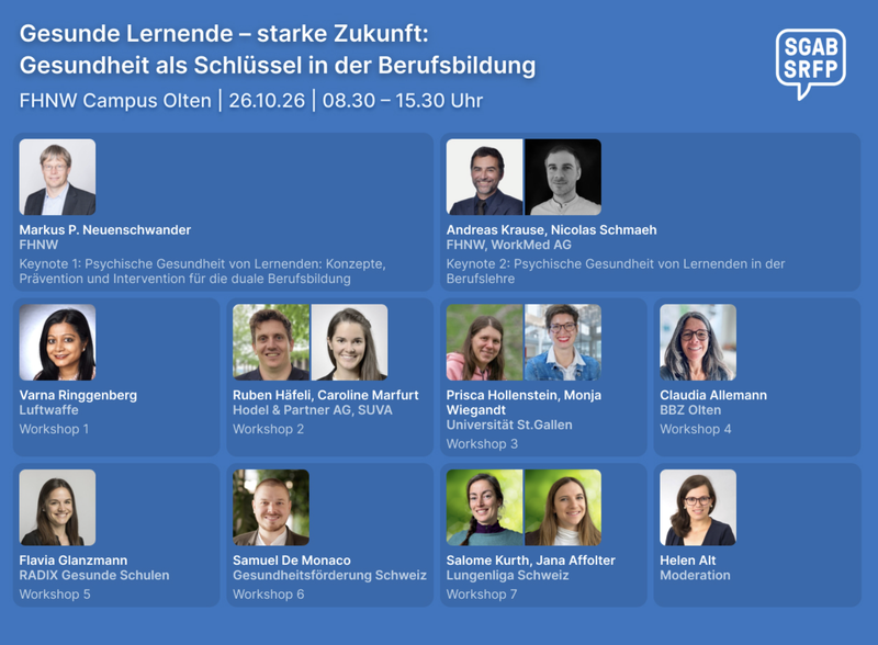 Am 26. Oktober 2026 veranstalten wir gemeinsam mit der Gesundheitsförderung Schweiz, der Suva und der Schweizerische Gesellschaft für angewandte Berufsbildungsforschung die Tagung: «Gesunde Lernende – starke Zukunft: Gesundheit als Schlüssel in der Berufsbildung».