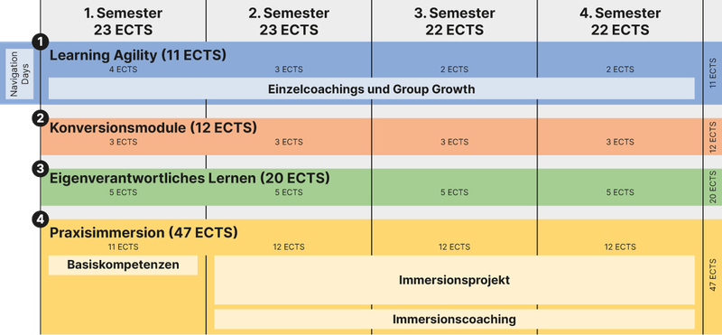 Dies geschieht durch eine gezielte Auseinandersetzung mit Ihren bestehenden Kompetenzen und den Bereichen, in denen Sie sich weiterentwickeln möchten. Im Rahmen eines strukturierten Lerncoachings entwickeln Sie Learning Agility (11 ECTS-Punkte) und übernehmen Verantwortung dafür, Ihr individuelles Kompetenzprofil zu definieren und systematisch zu erreichen.