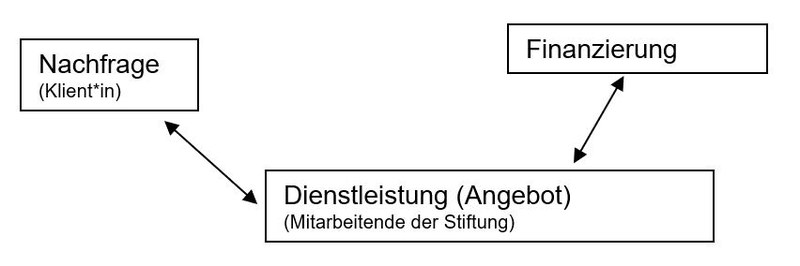 Eine soziale Institution in der Schweiz wird häufig von Dritten finanziert. Nehmen wir als Beispiel eine kleine Stiftung: Mitarbeitende erteilen Auskünfte, beraten und unterstützen ihre Klientinnen und Klienten. Finanziert wird dies aus Spendengeldern und unterstützt durch das ehrenamtliche Engagement von Mitarbeitenden. Die Stiftung steht somit in einem Angebots-Dreieck: