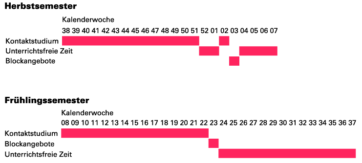 Studienbeginn ist jeweils in der Kalenderwoche 38 (Herbstsemester) bzw. Kalenderwoche 8 (Frühlingssemester). Die unterrichtsfreie Zeit benötigen Sie für Semesterarbeiten, Praxisausbildung, Projektarbeiten und das individuelle Selbststudium. Jedes Semester besteht aus 15 Kalenderwochen und einem Blockangebot wie die Summer School.