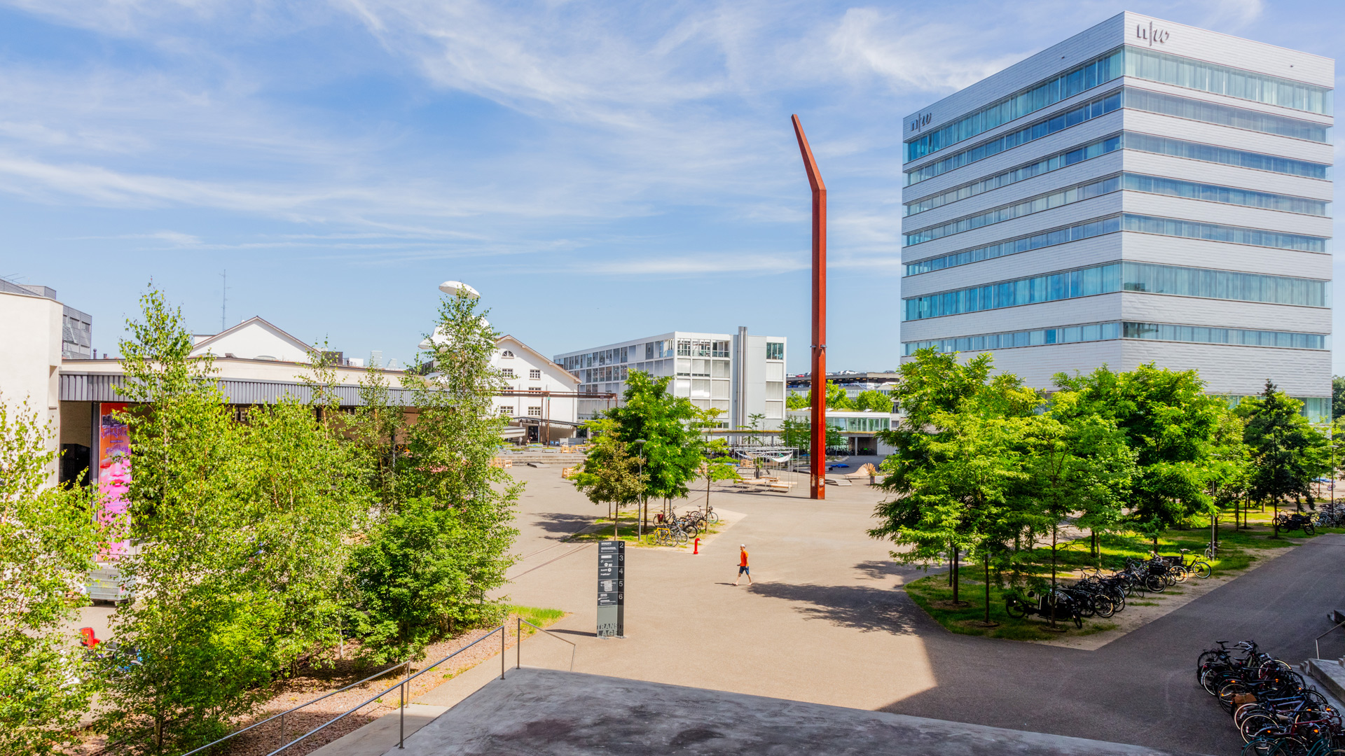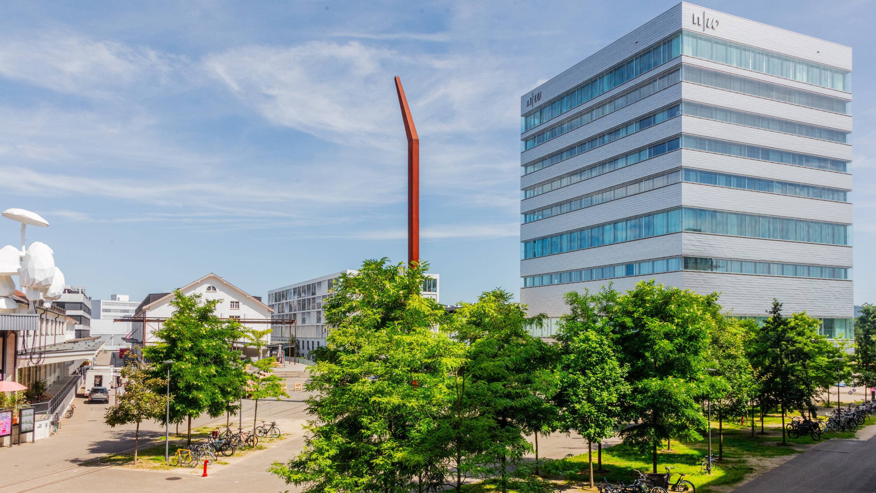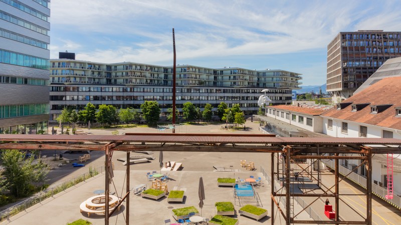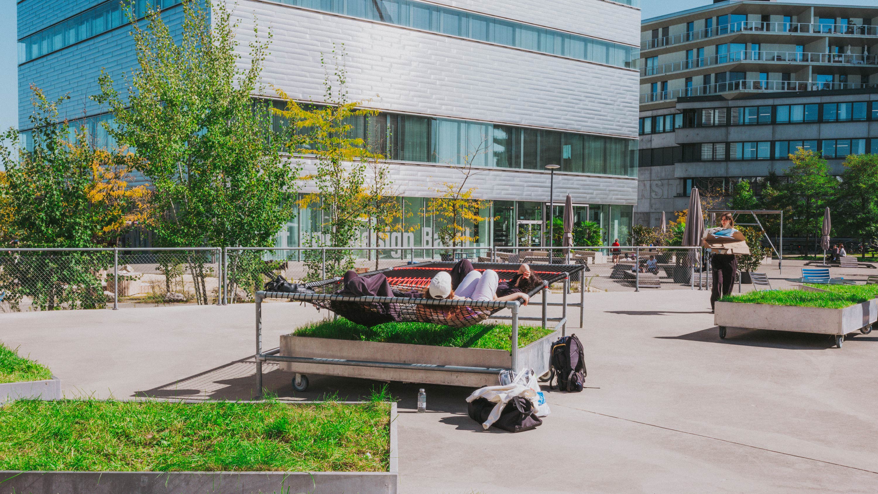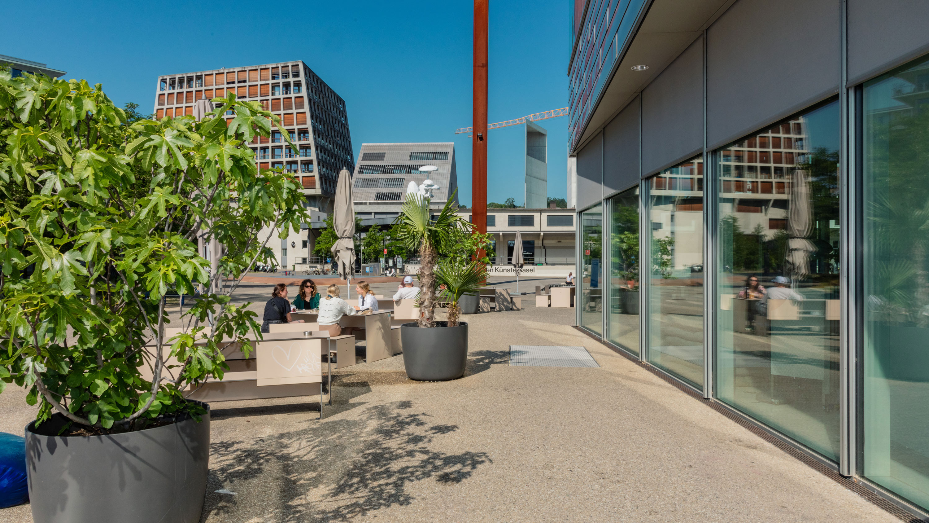 Die Hochschule für Gestaltung und Kunst Basel FHNW (HGK Basel) befindet sich in historischen Gebäuden wie auch im Hochhaus-Neubau auf dem Campus Dreispitz. Auch die Campus.Werkstätten und der Ausstellungsraum ‹ TANK › befinde sich auf dem Gelände rund um den Freilager-Platz. Dieser bildet dieser das Zentrum einer Nachbarschaft mit Akteur:innen aus Kunst und Kultur, Design und Kreativwirtschaft. Foto: Pati Grabowicz