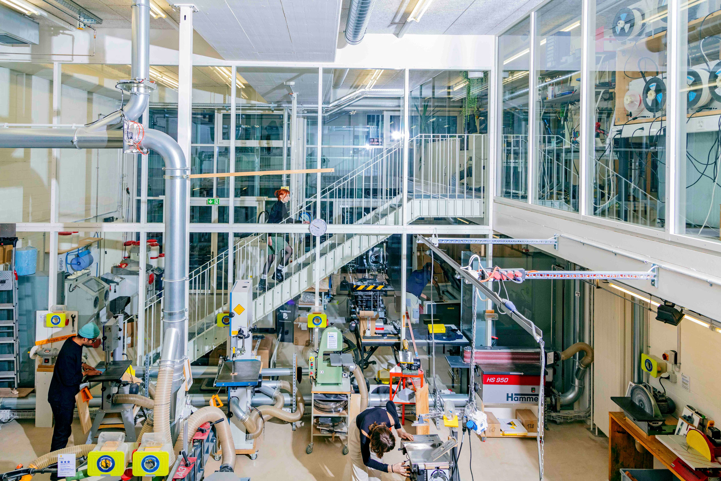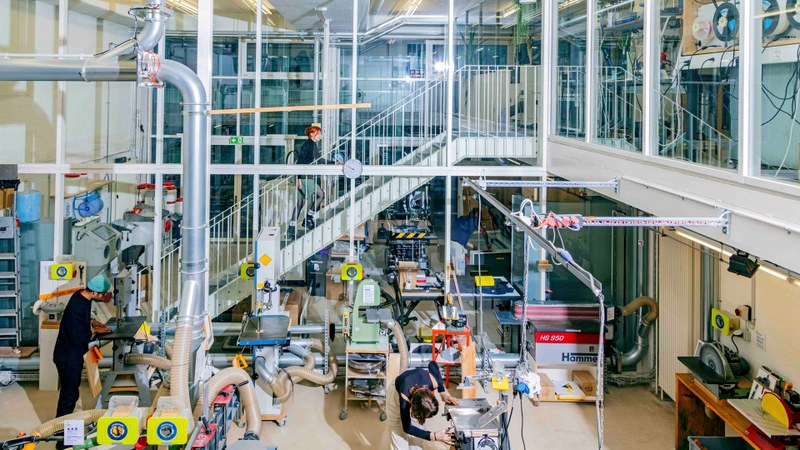 Holz, Metall, Kunststoff, 3D-Druck, Lackieren, Bildhauerei, Siebdruck, Buchbinden, Nähen, Digital Fabrication Lab, Foto-, Video- und Audiolabs: Die hochschuleigenen Werkstätten und Ateliers auf dem Campus ermöglichen das Erlernen von analogen Techniken und digitalem Know-how. Die Campus.Werkstätten sind für Studierende, Dozierende und Mitarbeitende nahezu das ganze Jahr zugänglich. Foto: Pati Grabowicz