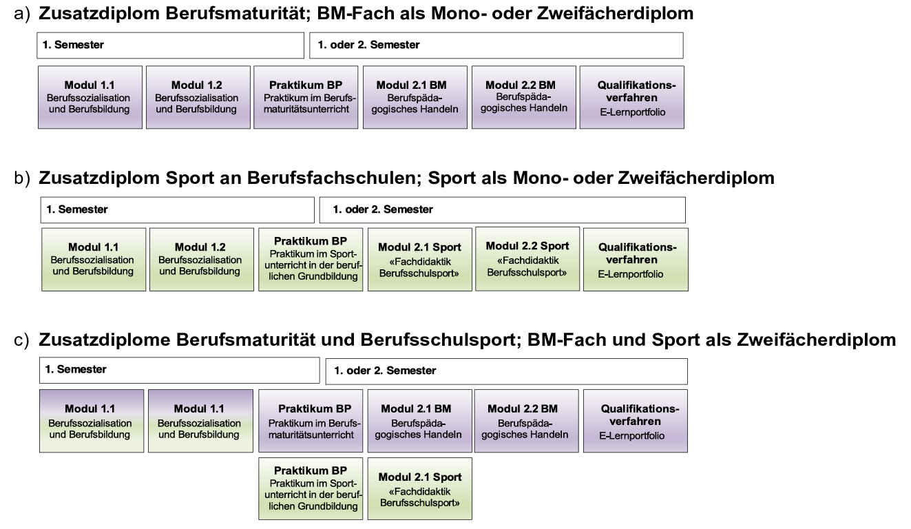 Die Module der Zusatzqualifikation Berufspädagogik werden semesterweise angeboten und der Kontaktunterricht findet montags statt. Eine Ausnahme bilden die Module 2.1 Sport und 2.2 Sport. Diese finden jeweils im Herbstsemester statt.