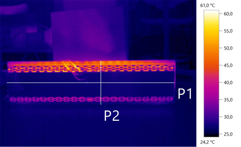 Abb. 3: Wärmebildaufnahme der Fussleistenheizung mit Abdeckung bei Betriebstemperatur 125°C Wärmebildaufnahme der Fussleistenheizung mit Abdeckung bei Betriebstemperatur 125°C