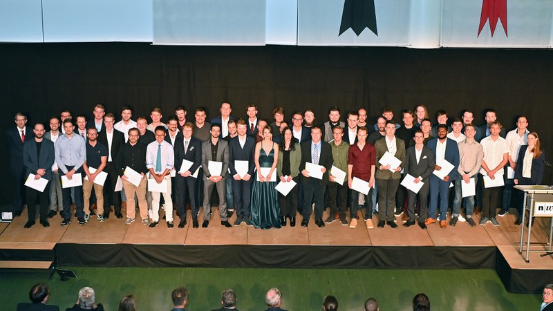 Die Diplompreise 2022 gingen in diesem Jahr an 21 Diplomandinnen und Diplomanden: jeweils die besten beiden Abschlussarbeiten jedes Studiengangs, sowie der mit 4000 Franken dekorierte regionale Siemens Excellence Award. Letzterer wurde an Robin Müller, Absolvent des Studiengangs Elektro- und Informationstechnik, überreicht. Er hat sich mit seiner Abschlussarbeit in die Welt des Quantencomputing gewagt und ein FPGA-basiertes Modul mitentwickelt, das den Kalibrierungsprozess von Qubits beschleunigt. Dabei handelt es sich um die kleinsten Recheneinheiten eines Quantencomputers, die – im Gegensatz zu herkömmlichen Bits – komplexe Zustände annehmen können. Sie können etwa gleichzeitig 1 und 0 sein, oder sich mit weiteren Qubits verschränken. Diese Zustände sind es, was Quantencomputer so leistungsfähig werden lassen. Sie können bestimmte Berechnungen, für welche ein heutiger Supercomputer Jahre benötigen würde, innerhalb weniger Sekunden lösen.