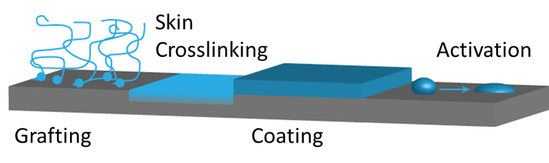 - Bei der Grafting-To Methode werden Polymere mit funktionalen Gruppen zum Beispiel mittels Elektronenbestrahlung auf der Oberfläche kovalent verankert und können so die Benetzbarkeit und weitere Eigenschaften verändern.