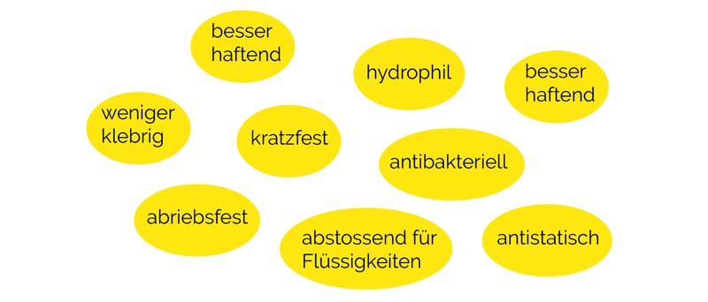 Durch die Oberfläche kommt ein Material in Kontakt zur Aussenwelt – dadurch entstehen einerseits Anforderungen an Optik und Haptik, aber auch sehr viele andere Oberflächeneigenschaften haben eine direkte Auswirkung auf die Anwendung. Dies ist nicht nur ein Problem, sondern auch eine Chance: wir können der Oberfläche auch Eigenschaften verleihen, die das Grundmaterial nicht hat. Unsere Projektpartner benötigen für ihre Produkte eine Vielzahl unterschiedlicher Oberflächeneigenschaften, zum Beispiel: