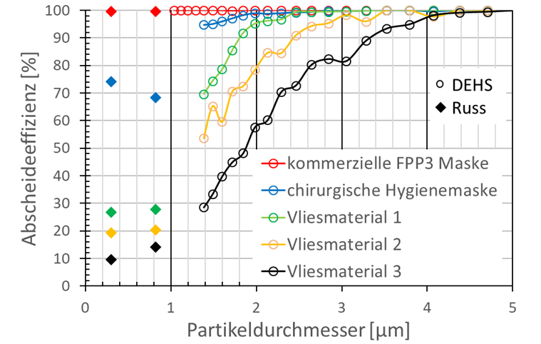 Die Messungen geben jedoch einen Anhaltspunkt bei der Beurteilung der Abscheideeffizienz. Sie bieten zudem die Möglichkeit, verschiedene Filtermaterialien speditiv und unkompliziert zu vergleichen, die von einer Herstellerfirma von Ein- und Mehrwegmasken bezüglich unterschiedlicher Parameter optimiert sind. So können neben einer Einschätzung der erreichten Filtereffizienz wertvolle Hinweise darauf gegeben werden, welche Parameteroptimierungen sich bei einer zukünftigen Verbesserung der Filtermaterialien positiv auf die Abscheideeffizienz auswirken.