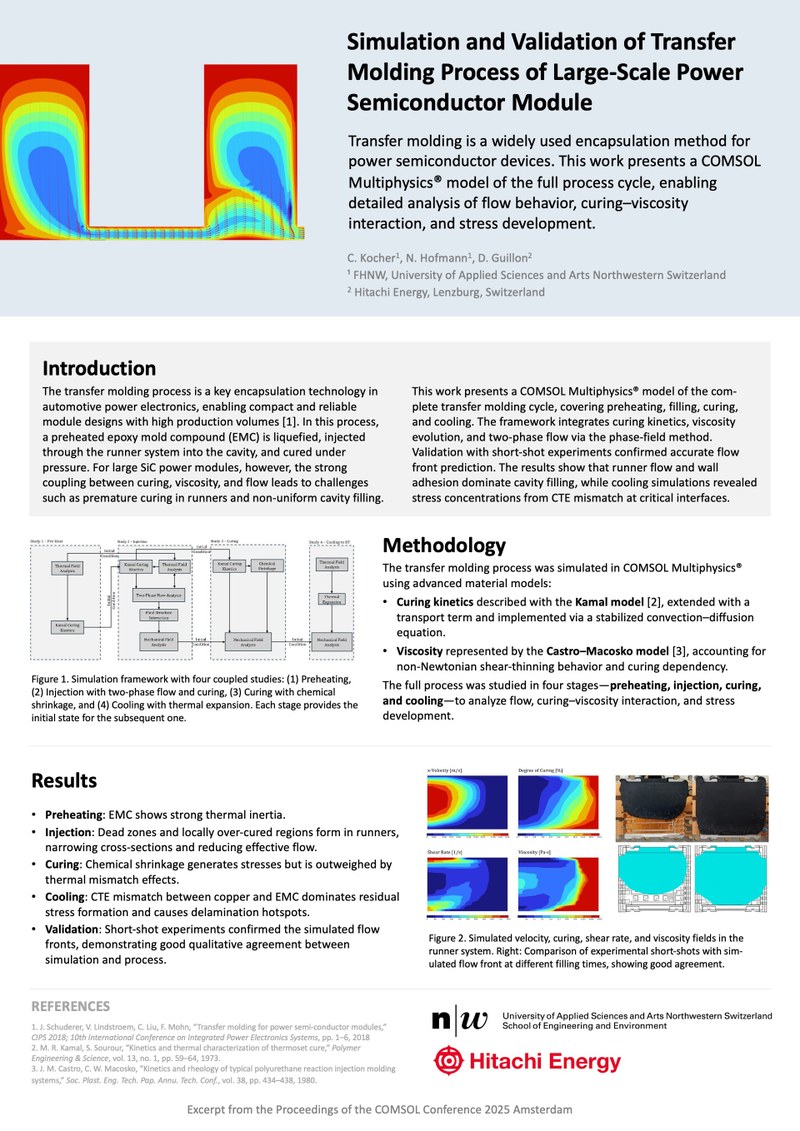Die jährlich stattfindende COMSOL Conference zählt mit über 400 internationalen Teilnehmenden zu den wichtigsten Plattformen für Multiphysics-Simulationen in Forschung und Industrie. Cédric Kocher, der am 25. September 2025 sein MSE-Studium an der Hochschule für Technik und Umwelt FHNW erfolgreich abgeschlossen hat, präsentierte dort im Rahmen eines Invited Tasks sein Forschungsprojekt «Process simulation and validation of entire transfer molding process of RoadPak power semiconductor module».