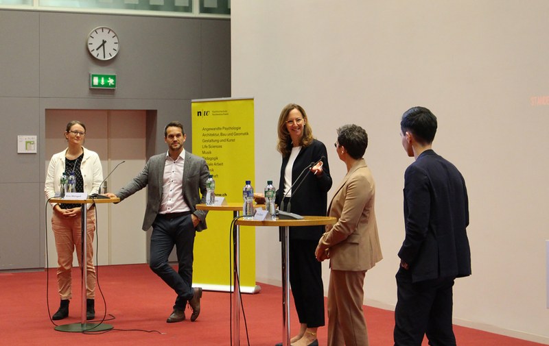 Zum Abschluss diskutierten die Rednerinnen und Redner mit Prof. Dr. Doris Agotai, Leiterin Forschung und Entwicklung an der Hochschule für Technik FHNW, über die weitere Entwicklung, Chancen und Risiken von künstlicher Intelligenz.