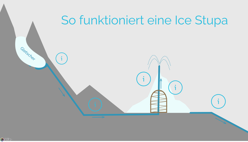 Das Prinzip der künstlichen Eisberge ist simpel: Schmelzwasser fliesst durch eine Rohrleitung talwärts. Durch den Höhenunterschied entsteht ein Druck, mit dem das Wasser in eine vertikale Lanze gepumpt wird. An der Spitze der Lanze sprudelt das Wasser heraus, wie bei einem Springbrunnen. Die feinen Wassertropfen lagern sich auf einem groben Gerüst aus Weideästen ab und gefrieren an der kalten Luft. Im Laufe der Zeit entstehen Eiskegel – ähnlich wie die kegelförmigen buddhistischen Kultbauten, die sogenannten Stupas. Im Frühling schmilzt das Eis langsam und versorgt die Bauern kontinuierlich mit Wasser.