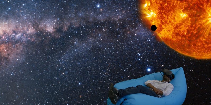 Aus der Vision eines friedlichen Zugangs zum Weltraum entstand die Idee einer Virtual-Reality-Applikation (VR). «Wir wollten herausfinden, ob es mit VR möglich ist, eine Wahrnehmung von räumlicher Grösse zu erzeugen, die sonst auf der Erde nicht möglich ist», erklärt Sathiapal. Sie taufte das Projekt «floating in space» – im Weltraum schweben – und beauftragte die zwei Informatik-Studenten Kevin Biehler und Marcel Groux. Diese entwickelten vier verschiedene Szenarien, in denen den Nutzern bestimmte Aspekte wie die Grösse der Planeten oder die Distanzen im Weltall veranschaulicht werden. Mit der VR-Brille aufgesetzt navigieren die Anwenderinnen und Anwender durch die virtuelle Welt und können durch das Sonnensystem spazieren oder Planeten nach Grösse sortieren. Dabei wird beispielsweise deutlich, wie riesig die Sonne im Vergleich zu den Planeten oder wie weit Neptun von der Sonne entfernt ist. Zur Anwendung gehört auch ein «Entspannungsmodus», wo man sich einfach im Weltall schwebend erholen kann. Auf einem realen Sitzsack liegend kann man so in der Weite des Sonnensystems meditieren. Die 360-Grad-Szenarien stammen von Aufnahmen aus verschiedenen NASA-Missionen.