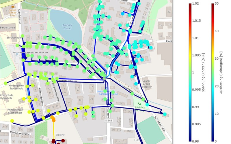 Die Kombination aus «Smart Meter»- und Netzstammdaten ermöglicht eine Berechnung des aktuellen Netzzustandes nahe an Echtzeit. Somit können auf Basis der bestehenden Infrastruktur wichtige Grössen wie die Spannung an allen Netzknoten und die Auslastung der Kabel ermittelt werden, ohne dass dafür zusätzliche Instrumente und Systeme installiert werden müssen. Der konkrete Beitrag des Instituts für Elektrische Energietechnik besteht in der Entwicklung der Modelle und Algorithmen zur Bestimmung des Netzzustandes.