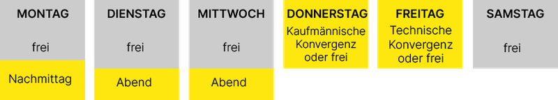 - Im ersten Semester finden die Vorlesungen am Montag ab 15 Uhr, Dienstag und Mittwoch jeweils am Abend sowie am Donnerstag oder Freitag statt: Studierende mit technischer Vorbildung belegen die kaufmännische Konvergenz am Donnerstag und Studierende mit kaufmännischer Vorbildung die technische Konvergenz am Freitag.