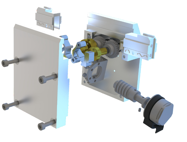 3-D-Explosionsansicht des kompletten konstruierten Greifers inklusive Antrieb (der Festkörpermechanismus ist klein im Zentrum zu sehen).