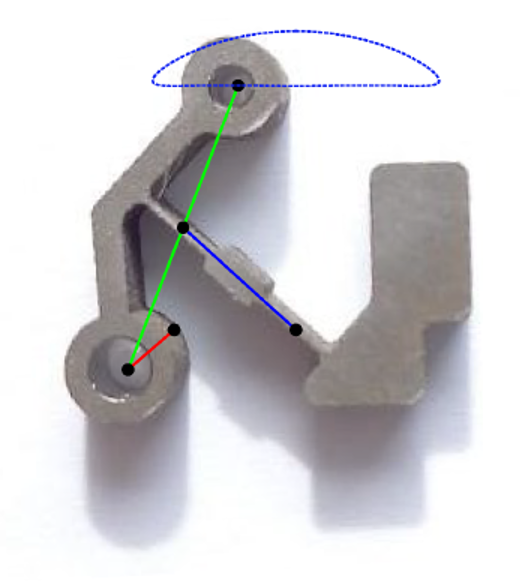 Hergestellter Festkörpermechanismus (zugrundeliegender Starrkörpermechanismus in rot, blau und grün dargestellt; blau gestrichelt die durch den obersten Punkt durchführbare Bewegung).