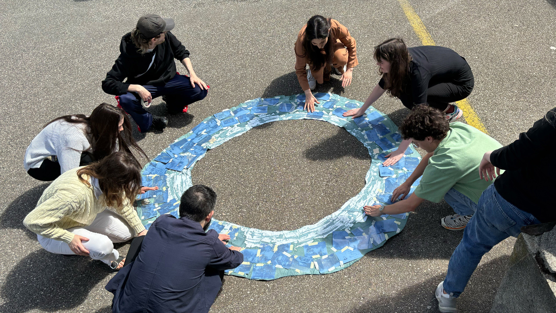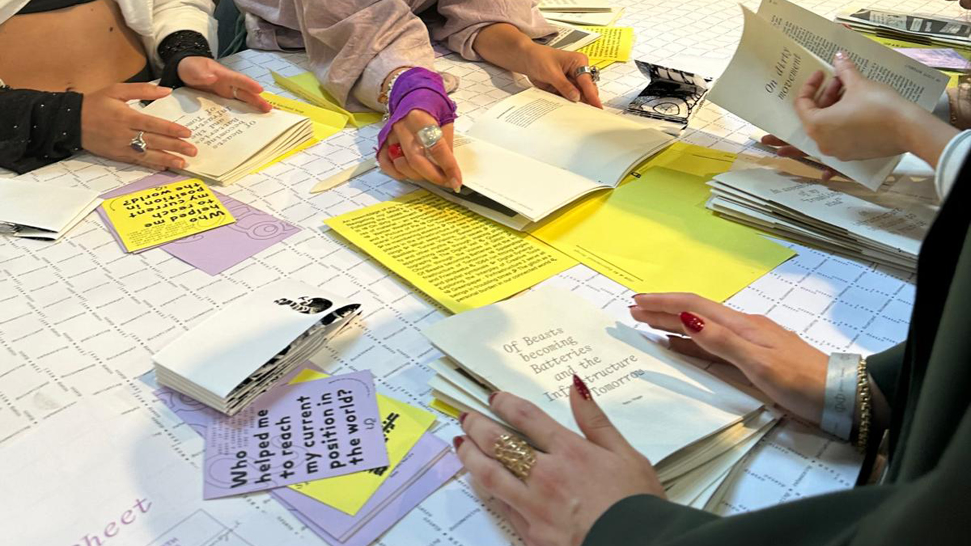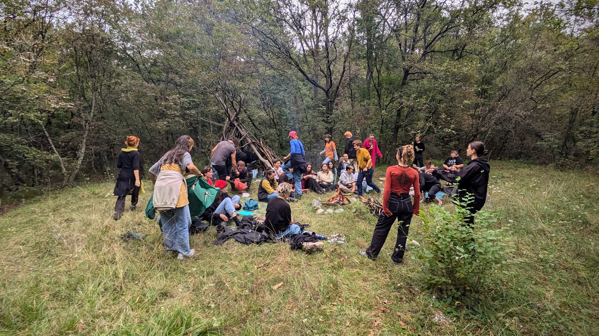 Student-organized talk series "Chatty Chatty" by Camila Chebez, Fabian Frey, Maria Maddalena Lenzi, and Danuka Tomas to gather, exchange ideas, and connect meaningfully with invited guests. Here in conversation with Bianca Elzenbaumer (Brave New Alps / La Foresta) in the forest of Rovereto during a study trip to Italy, 2024. Photo: Kit Braybrooke.