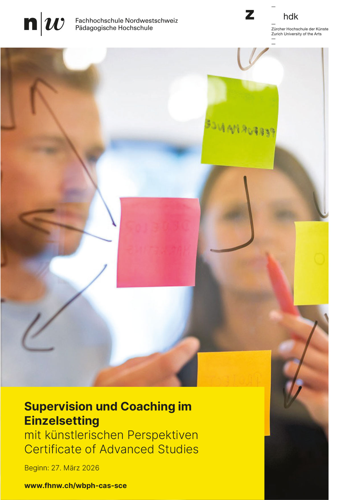Sie möchten Ihre Kompetenzen erweitern und wollen lernen, wie Sie Supervisions- und Coaching-Situationen unter Einbezug von künstlerischen Perspektiven professionell gestalten können. Als ausgebildete Fachperson im sozialen Bereich mit vertiefter künstlerischer Praxis oder als Künstler:in mit psychologisch orientierter Vorbildung wollen Sie sich ein neues Berufsfeld erschliessen. Im CAS-Programm «Supervision und Coaching im Einzelsetting» werden Sie in Theorie und Praxis für Supervisions- und Coachingaufträge ausgebildet.