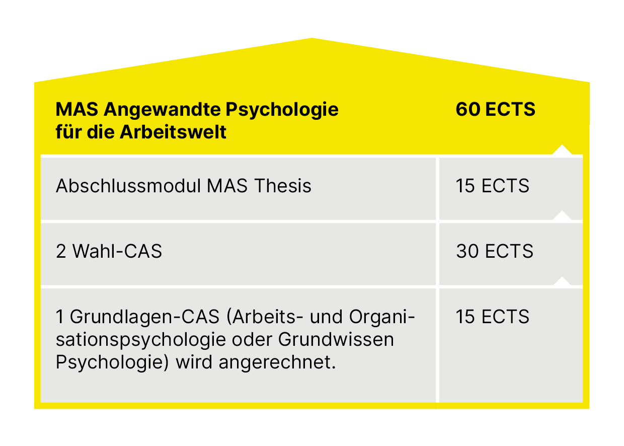 - Durch die Anrechnung eines der beiden Grundlagen-CAS (Grundwissen Psychologie bzw. Arbeits- und Organisationspsychologie) verringert sich Ihr zeitlicher und finanzieller Aufwand.