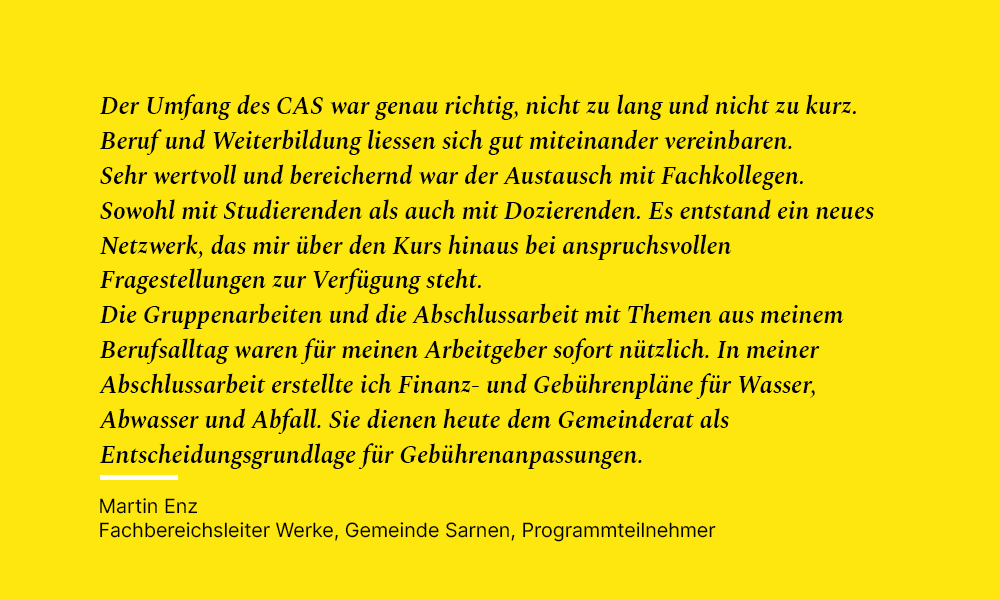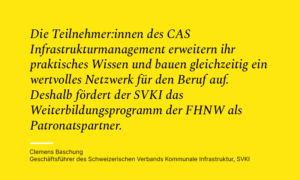Umfassende Fachkenntnisse im Bereich der kommunalen Infrastruktur sind unerlässlich. Wirksam werden sie erst, wenn Sie Ihre Erkenntnisse für Entscheidungsträger verständlich machen können. Im CAS Infrastrukturmanagement aktualisieren Sie Ihr Fachwissen und lernen, den Behördenmitgliedern adressatengerechte Entscheidungsgrundlagen zur Verfügung zu stellen. Sie können nachhaltige und zukunftsgerichtete Entscheidungen der politisch Verantwortlichen erwirken. Durch die Verzahnung von theoretischem Wissen mit praktischer Anwendung, in Fallstudien und einer Abschlussarbeit, die auf Ihre beruflichen Herausforderungen zugeschnitten ist, bietet der Kurs nicht nur neues Wissen, sondern auch sofort umsetzbare Lösungen für die täglichen Aufgaben in Ihrem Berufsfeld.