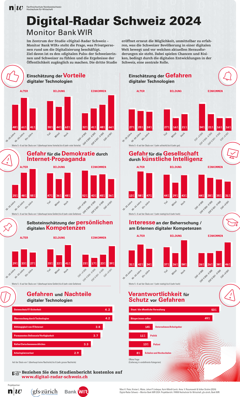 Wie bereits in den Vorwellen zeigen die Umfrageresultate, dass ein Diskurs stattfinden muss. Die Wissensvermittlung zu digitalen Technologien muss stark intensiviert werden. Politik und Wirtschaft sind gefordert, Ängste abzubauen und Lösungen zu entwickeln. Darüber hinaus müssen Bürgerinnen und Bürger lernen, sich das notwendige Wissen zu digitalen Technologien anzueignen. Dies sind Herausforderungen, die übergreifend angenommen werden müssen und deren Umsetzung verantwortungsbewusst getragen werden sollte.
