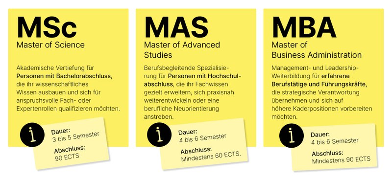 Ein MAS-Programm ist ein nicht-konsekutiver Weiterbildungs-Master mit mindestens 60 ECTS. Er richtet sich an Personen mit Hochschulabschluss (Bachelor oder Master) und relevanter Berufserfahrung.