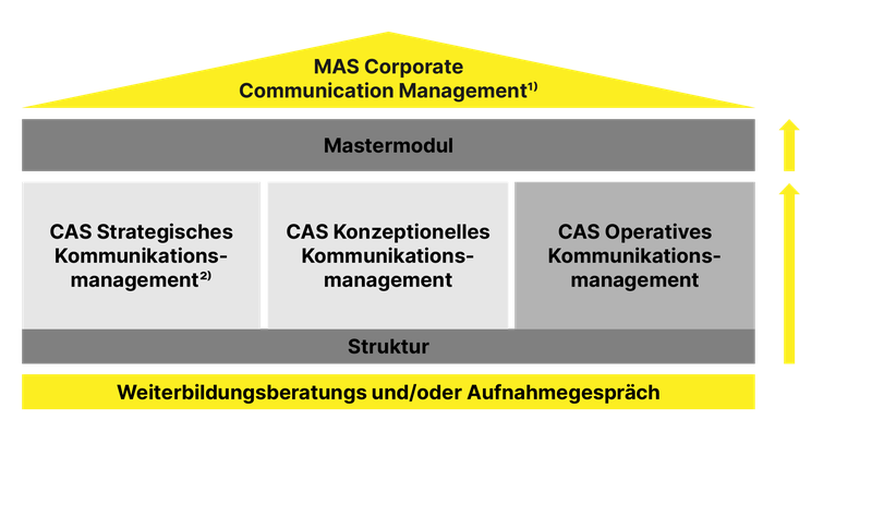 Sie können den CAS zum DAS (Diploma of Advanced Studies) Integriertes Kommunikationsmanagement oder zum MAS in Unternehmenskommunikation (MAS Corporate Communication Management) weiterentwickeln.