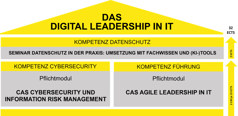 Das Weiterbildungsprogramm ist modular konzipiert und vereint strategisches IT-Leadership mit zertifizierter Fachkompetenz in Cybersecurity und Datenschutz. Die Weiterbildung umfasst insgesamt 32 ECTS-Punkte und lässt sich berufsbegleitend absolvieren.