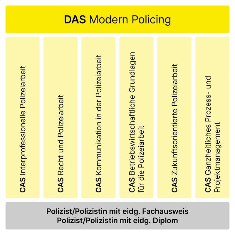 Das «DAS Modern Policing» ist modular aufgebaut und besteht aus thematisch eigenständigen und in sich abgeschlossenen CAS-Weiterbildungen. Aus einem Angebot von sechs CAS-Lehrgängen wählen Sie drei aus, um Ihre individuelle Weiterbildung zu gestalten.