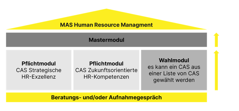 Das Programm besteht aus drei CAS-Zertifikatskursen, die in beliebiger Reihenfolge besucht werden können, und einem Mastermodul (mit begleiteter MAS-Arbeit).