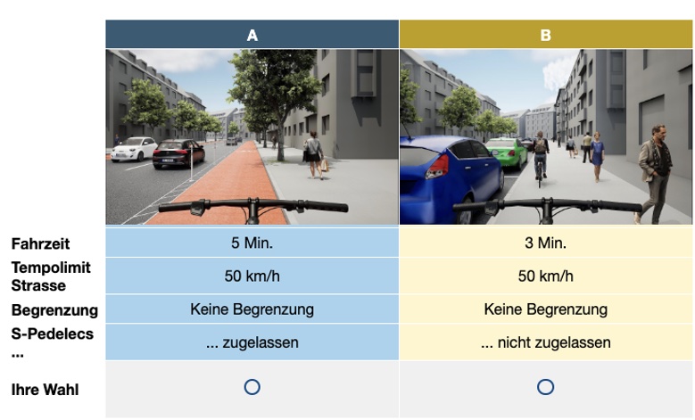 The survey consists of two parts: cyclists, e-bike riders and S-pedelec riders take part in an image-based stated preference route choice experiment as part of a web-based survey. The images are generated on the basis of an experimental design and visualised using ESRI City Engine and Unreal.