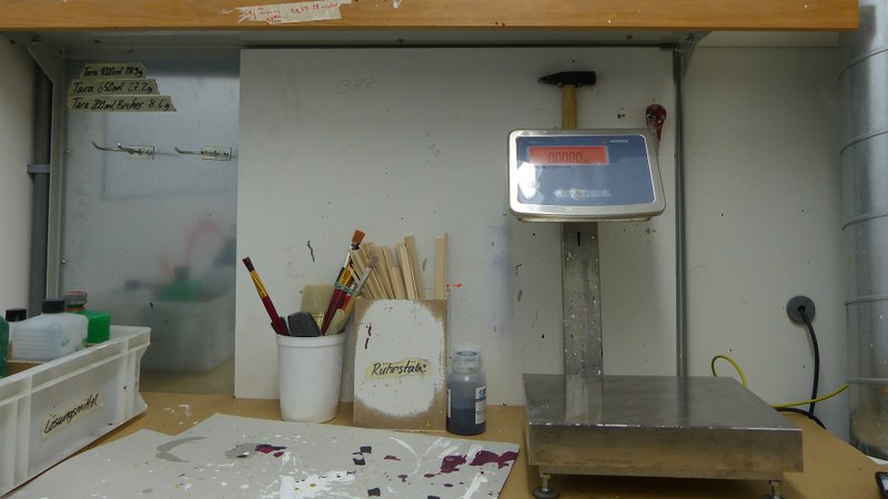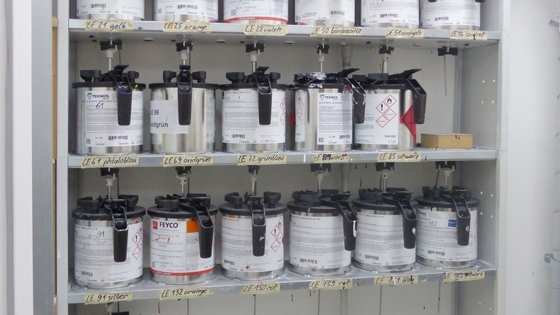 Thanks to a highly efficient extraction system, we can work with both water-soluble and solvent-based paints, which are applied with the help of spray cans or spray guns. Using a professional mixing system makes it possible to mix colours according to RAL, NCS standards and the like.