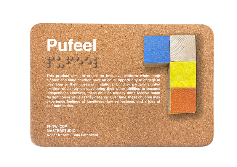 Kosar Kazemi's and Sina Fathollahi's three-dimensional puzzle "Pufeel" is designed for customers with and without visual impairments. Intended for use in kindergartens, the puzzle promotes inclusive play through a unique tactile experience.