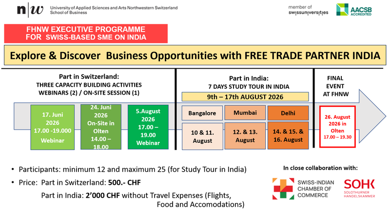 Unlock the potential of one of the world’s fastest-growing markets. This executive programme equips Swiss SMEs with the knowledge, insights, and networks needed to successfully enter and operate in India. Through a combination of seminars, webinars, company visits, and a study tour, participants gain firsthand experience and build strategic partnerships.