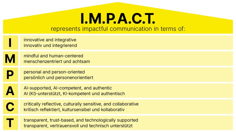 I.M.P.A.C.T. is the center of excellence for effective communication in the age of new technologies (e.g., AI). With practical solutions, we promote and shape future-oriented communication at the interface between people, technology, and society in order to communicate effectively, responsibly, and humanely in an increasingly digitalized world.
