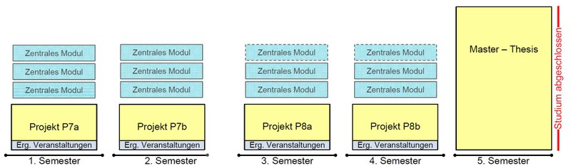 Example full-time model: 3 semesters with an even distribution of modules, with the Master’s thesis in the final semester.