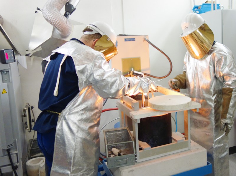 Various melts of up to four litres in volume can be created in the induction-heated crucible furnace with lift coil mechanism. The furnace has a heating capacity of 50kW.