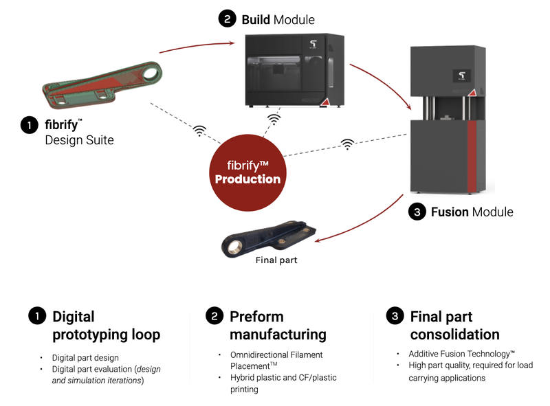 With the Fibrify® design and production software developed by 9T Labs and a holistic process simulation as well as the Additive Fusion Technology™, the printed CFRP components are manufactured in industrial quality.
