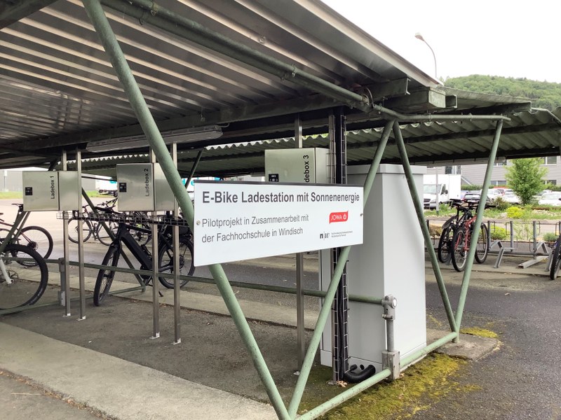 The autonomous charging station with three e-bike charging ports was installed at the location of our project partner JOWA in Gränichen in autumn 2019 and has been in operation there since then. Data (currents, voltages, temperature, energy production and consumption) are recorded and can be read out remotely. The measurement data are used to optimize the control algorithm for even higher availability for e-bike charges.