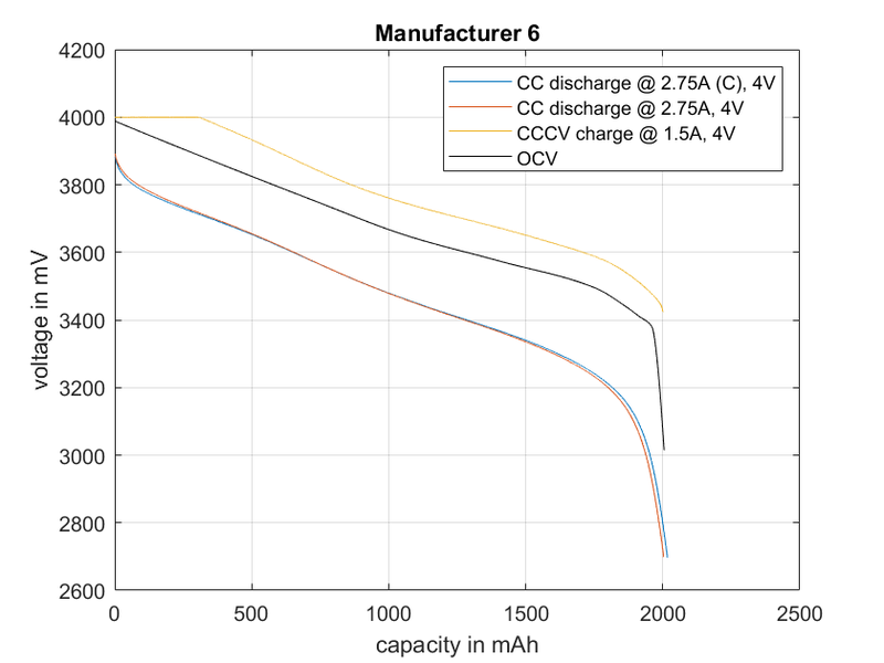 Aged lithium-ion cells of the same type but from different manufacturers were characterized and compared. Except that they come from e-bike batteries, their history is not known. The spread of cell capacities, internal resistances and charging and discharging characteristics could be evaluated. Typical measured characteristic curves for a manufacturer's cell are shown in the following graphic. It has already been recognized that the scatter of the parameters of aged cells behaves differently depending on the manufacturer.