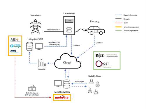 Project team | Ostschweizer Fachhochschule, Mobility Genossenschaft, Azienda Elettrica di Massagno SA, Elektrizitätswerk der Stadt Zürich, Primeo Netz AG. |