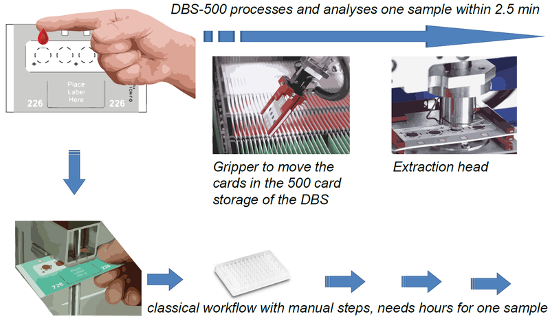 Classical DBS punching versus online CAMAG DBS-500. The classical workflow includes a semi-automatic punch-out step whereas the automated DBS-500 allows direct extraction of blood spots into the mass spectrometer.