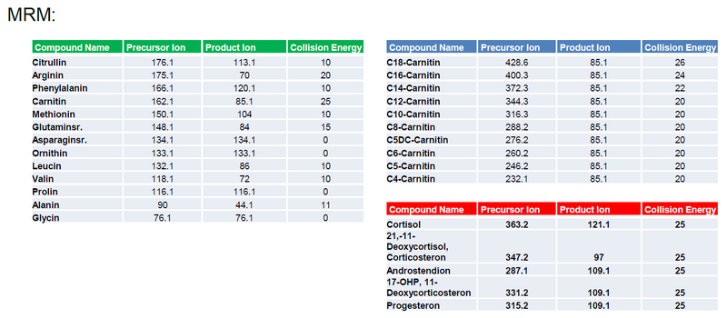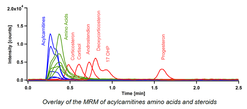 Most compounds are separated by MRM only. Deoxycorticosteron and 17 OHP, which have the same MRM, are separated by chromatography.