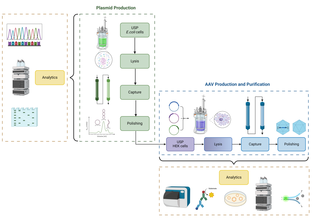Adeno-associated viruses (AAVs) have great potential as delivery vehicles for gene therapy. The production of therapeutic AAVs is complex and requires many steps to get to the final product: Plasmid production and purification, cell expansion, plasmid transfection and finally AAV production and purification.