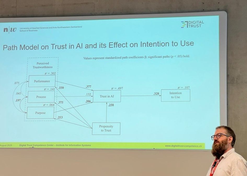 First, Jona Karg presented our paper Propensity Matters – An Empirical Analysis on the Importance of Trust for the Intention to Use Artificial Intelligence by Jona Karg, Frank Ritz and Petra Maria Asprion. Our study shows that the propensity to trust is the crucial aspect in AI adoption: while many factors influence the intention to use AI, trust plays a decisive role.