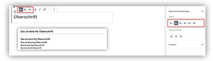 Mit Überschriften können Sie Ihre Seite thematisch unterteilen. Die Überschriften können in verschiedenen Grössen dargestellt werden (H2-H6 Überschrift). Achten Sie dabei auf eine hierarchische Anordnung der Überschriften und bitte vermeiden Sie (die gelb unterstrichenen) H1-Überschriften innerhalb der Seiteninhalte, diese sind nur zulässig als Überschrift zu Beginn einer Seite.