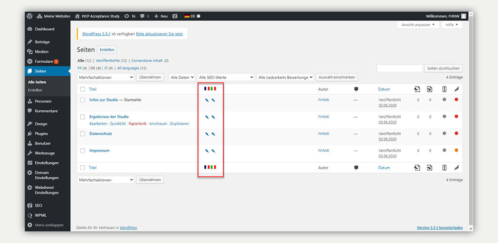 Nach erfolgreicher Konfiguration können Sie nun Ihre Seiten und Beiträge über die entsprechenden Länderflaggen-Icons in den jeweiligen Sprachen übersetzen.
