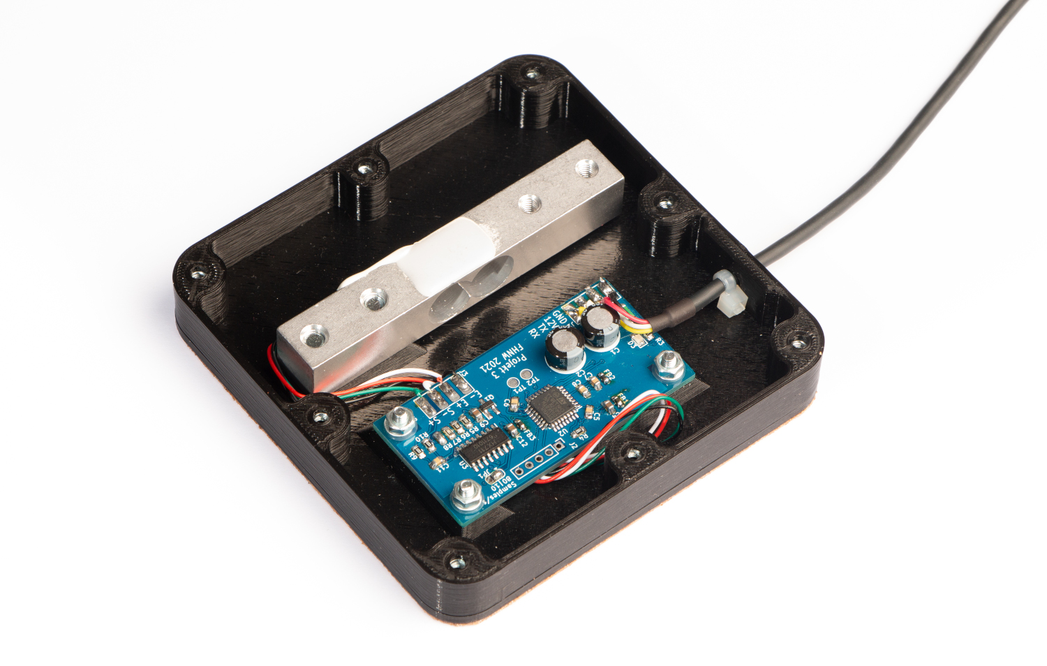 Um das Ziel der geringen Bauhöhe zu erreichen, wurde eine Wägezelle verwendet. Dabei handelt es sich um ein speziell geformtes Metallstück mit einem aufgeklebten Dehnungsmessstreifen. Die Kraft des aufgelegten Gewichts führt zu einer Verformung des Metalls, welches wiederum den Dehnungsmessstreifen staucht oder dehnt. Der Widerstand des Dehnungsmessstreifen ändert sich durch die Verformung leicht. Eine passend designte Elektronik erfasst diese Änderung und sendet die erfassten Messwerte weiter ans IoT-Modul.