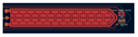 Der gewählte Sensor zur Messung der Bodenfeuchtigkeit nutzt eine kapazitive Messmethode. Dabei wird die Permittivität des Bodens gemessen, ein Wert, der sich je nach Wassergehalt ändert. In Abbildung 3 ist der Sensor dargestellt. Die positiven Elektroden sind die roten rechteckigen Plättchen und die negative Elektrode ist die rote Fläche selbst, die die Plättchen umschliesst. Diese Anordnung bildet einen Kondensator, bei dem der umgebende Boden als dielektrisches Material dient.
